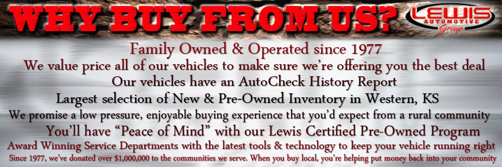 Ā "I have really enjoyed working with Joe on this purchase. He was caring, humorous and seemed dedicated to helping my husband and me find the car that best fit our desires and needs. I felt Joe tried very hard to get us the best deal possible and the best trade-in value for our current vehicle. I am very pleased with my experience and purchase with Lewis Ford Lincoln of Dodge City." Automotive Specialist: Joe Kelley | Lewis Ford Lincoln of Dodge City Customer: Rebecca | Hugoton, KS ![]() | Ā "We've known Darrell for many years and visit with him very often. Every time we visit he is always nice and answers any question that we have. He is very sharp on the vehicles that we ask about. Very satisfied with Daryl's help. He is a salesman that I feel comfortable with at any time. Thank you!" Automotive Specialist: Darrell Warner | Lewis Toyota of Hays |